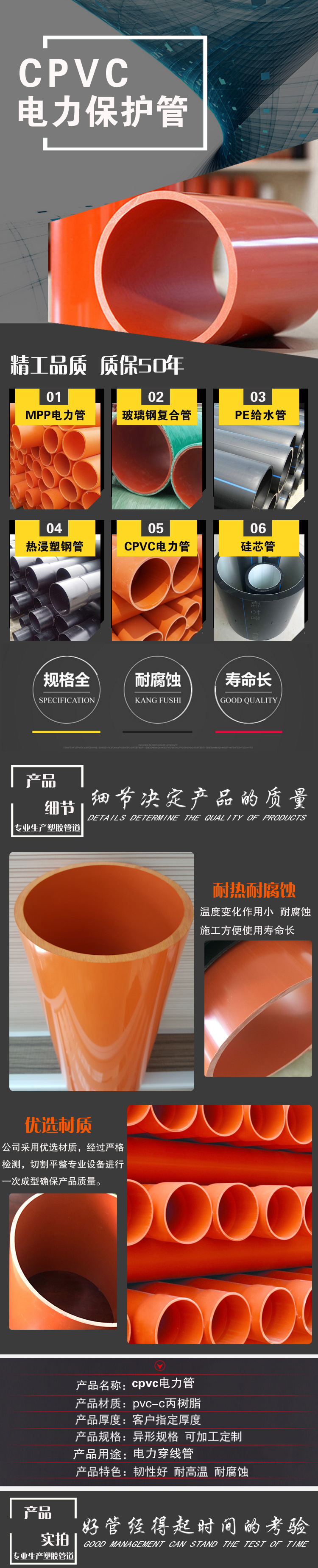 產品介紹:PVC-C樹脂為母料該產品具有高強度、柔韌性好、耐高溫、耐腐蝕、 阻燃、絕緣性能良好、不易老化、質輕、施工方便等特點, 其各項性能指標經有關部門鑒定和認證,均已達到或超過國內的同類 產品水平。產品性能大優于傳統的石棉電纜排管及普通PVC管材,是 傳統電力電纜護套管的理想替代品。
