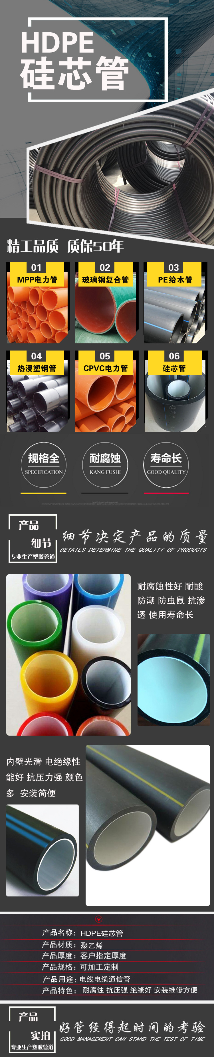 硅芯管是一種內壁帶有硅膠質固體潤滑劑的新型復合管道,密封性能好, 耐化學腐蝕,工程造價低,廣泛運用于高速公路,鐵路等的光電纜通信網絡 系統。HDPE硅芯管是一種內壁帶有硅膠質固體潤滑劑的新型復合管道, 簡稱硅管。由三臺塑料擠出機同步擠壓復合,主要原材料為高密度聚乙 烯,芯層為摩擦系數最低的固體潤滑劑硅膠質。廣泛運用于光電纜通信 網絡系統。