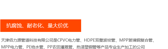 天津佰力源管道科技有限公司是熱浸塑鋼管、涂塑鋼管、MPP電力管、CPVC電力管、HDPE雙壁波紋管、MPP玻璃鋼復(fù)合管、MPP電力管、PE給水管、PP農(nóng)田灌溉管、熱浸塑鋼管等產(chǎn)品專(zhuān)業(yè)生產(chǎn)加工的公司,擁有完整、科學(xué)的質(zhì)量管理體系。 天津佰力源管道科技有限公司的誠(chéng)信、實(shí)力和產(chǎn)品質(zhì)量獲得業(yè)界的認(rèn)可。
