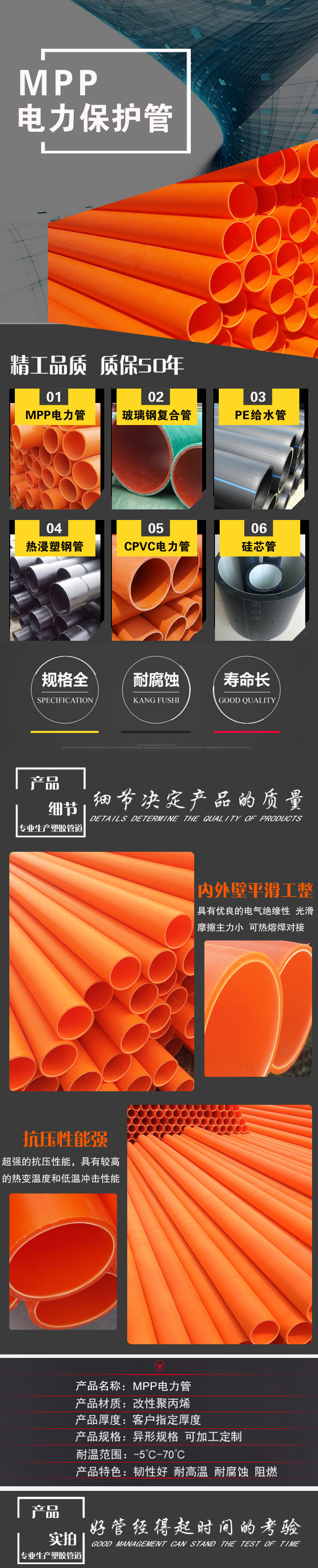 MPP電力管采用改性聚丙烯為主要原材料,是無須大量挖泥、挖土及破壞路面,在道路、鐵路、建筑物、河床下等特殊地段敷設管道、電纜等施工工程。與傳統的“挖槽埋 管法”相比,非開挖電力管工程更適應當前的環保要求, 去除因傳統施工所造成的塵土飛揚、交通阻塞等擾民因 素,這一技術還可以在一些無法實施開挖作業的地區鋪設管線,如古跡保護區、鬧市區、農作物及農田保護區、高速公路、河流等。